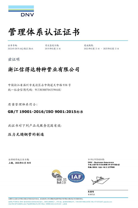 公司已全面通過了ISO9001:2008質量管理體系認證、14000環境管理體系認證、18000職業健康管理體系認證、國家質量檢驗檢疫總局A2-B類壓力管道元件制造許可、 歐盟PED認證及德國AD-2000產品強制認證、美國ASME材料產品認證、信得達擁有1條穿孔生產線,10條冷拔生產線8條冷軋特種無縫鋼管生產線。